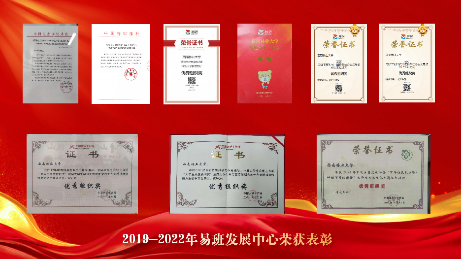 加强网络思政工作,选送全国易班头条200余篇,媒体报道50余篇,优课月使用排名、轻应用使用排名平均居云南省高校第一,进入全国排名均5次。党史学习教育主线活动“3个100”做到持续更新,持续维护,引起全国200余所高校近100万余人次参与学习。打造“一院一品一特色”绿色食品牌、健康生活目的地、植物志、书香西林等20余个网络思政文化品牌,累计发稿量500余篇,创作文化原创作品40余篇。2019至2022年多次获云南省委教育工委十佳优秀易班工作站表彰;获“十佳易班共建高校”荣誉称号,2020年获习近平新时代中国特色社会主义思想线上知识竞赛优秀组织奖、主题征文优秀组织奖;获教育部易班发展中心“两星级”易班工作站表彰;2021年荣获“全国易班优秀共建高校”荣誉称号;获“百年绿色长征路·峥嵘岁月报国情”优秀组织奖;获中国青年报“千校千项”暑期实践类表彰;2022年“易班网全国大学生简历设计大赛”活动荣获优秀组织奖;全国易班优课“新生入学教育活动”优秀组织奖。