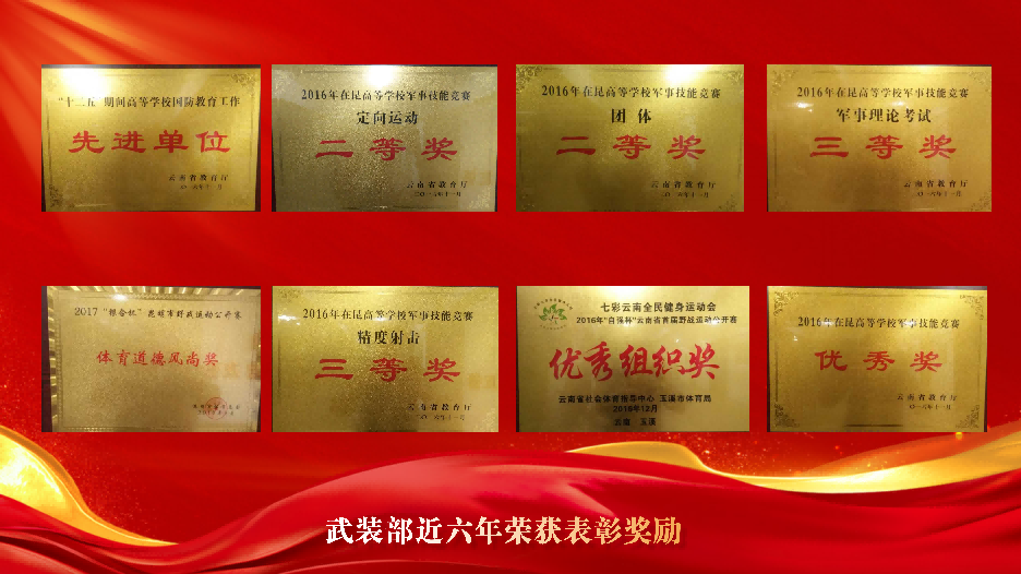 学校被教育部评为全国国防教育特色学校。学校荣获全省爱我国防演讲比赛优秀组织奖3次、荣获爱我国防知识网络竞赛优秀组织奖2次。国防教育特色活动被云南电视台制作成宣传短片广泛宣传报道。连续6年超额完成省征兵办下达的征兵工作任务,先后受到省教育厅、省征兵办、昆明市及盘龙区征兵办的表彰奖励。