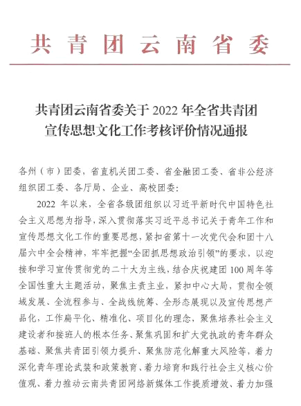 近日,共青团云南省委印发《关于2022年全省共青团宣传思想文化工作考核评价情况的通报》,我校团委获评“优秀”等次。