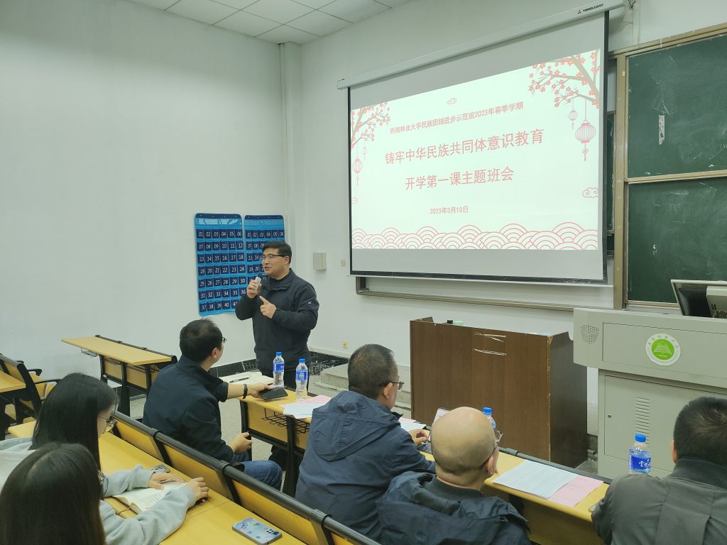 3月10日,我校民族团结进步示范班在第一图书馆G101教室举行2023年春季学期铸牢中华民族共同体意识主题教育“开学第一课”主题班会。校党委副书记、民族团结进步示范班班主任魏宏出席班会并为同学们上开学第一课。