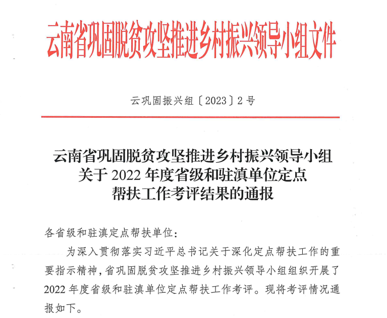 根据《云南省巩固脱贫攻坚推进乡村振兴领导小组关于2022年度省级和驻滇单位定点帮扶工作考评结果的通报》(云巩固振兴组〔2023〕2号),我校2022年定点帮扶工作考评结果为“好”等次。据统计,自2016年以来,我校定点帮扶工作连续7年获得“好”等次。