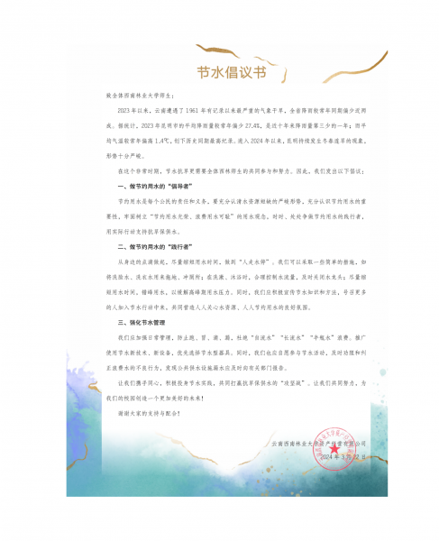 3月19日,为持续推进节水型高校建设,实现节水工作再上新台阶,云南西南林业大学资产经营有限公司举办“科学用水 合理用水 建设节水型高校”节水系列活动并提出节水倡议。