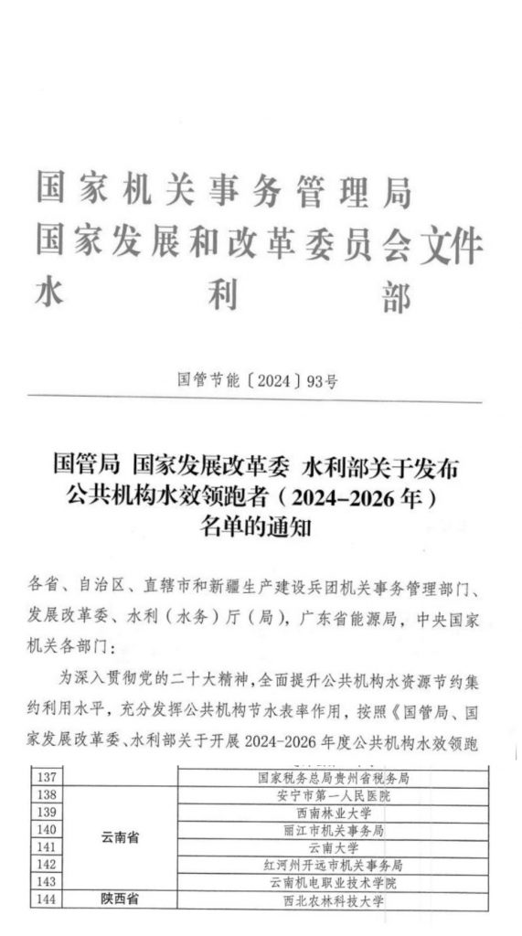 近日,国家机关事务管理局、国家发展和改革委员会、水利部联合发布全国“公共机构水效领跑者”名单,西南林业大学荣获“国家级公共机构水效领跑者”称号。