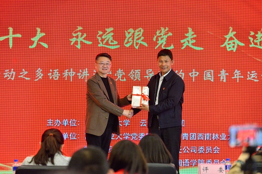 为更好回顾百年来党领导下的中国青年运动的宏伟历程,进一步加强对党史和团史的宣传和学习教育,由西南林业大学和云南出版集团联合主办的“喜迎二十大、永远跟党走、奋进新征程”主题系列活动之多语种讲述“党领导下的中国青年运动史”故事大赛,于5月6日在我校国际交流中心举办。我校党委副书记刘清江、云南出版集团党委副书记、董事李国安为大赛致辞。
